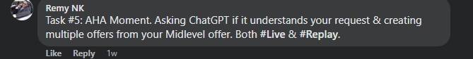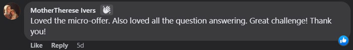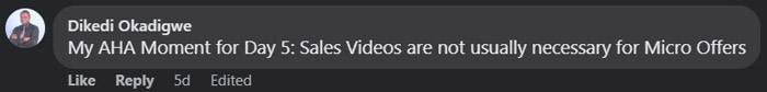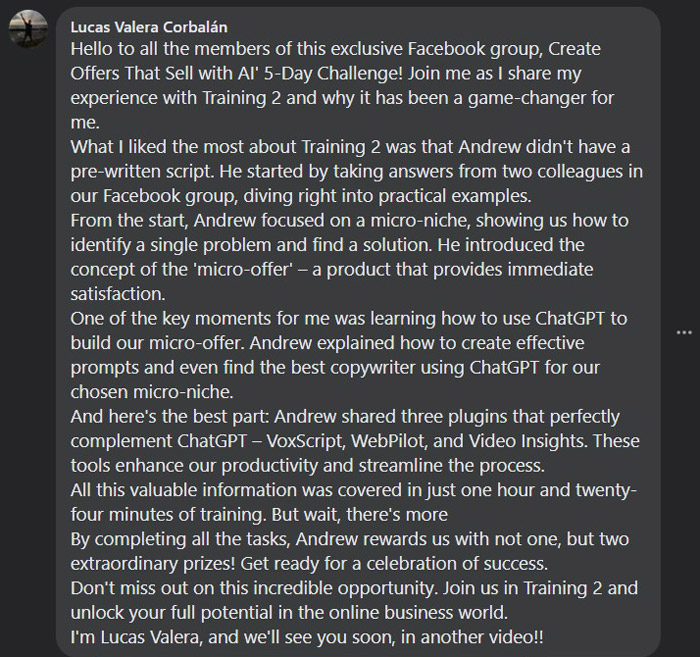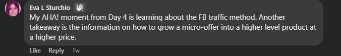 Exclusive Challenge Facebook group at no cost! It's a buzzing community where you can scoop up additional advice, build meaningful connections, and receive steadfast support throughout your 5-day journey of crafting irresistible AI-assisted micro-offers.