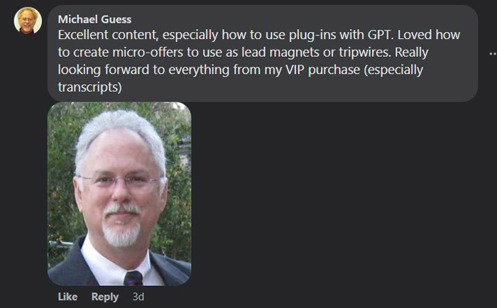 Together with the 5-Day “Create Offers That Sell Using AI” Challenge you will also get access to the recordings of VIP workshop.