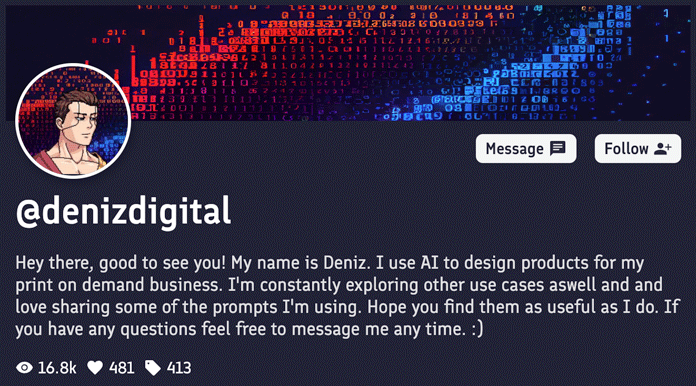 And let's not forget "DenizDigital" who rocks a Neo TOKYO NFT as his profile picture. Not only did he sell 413 prompts, but he's also using them in his print-on-demand biz.